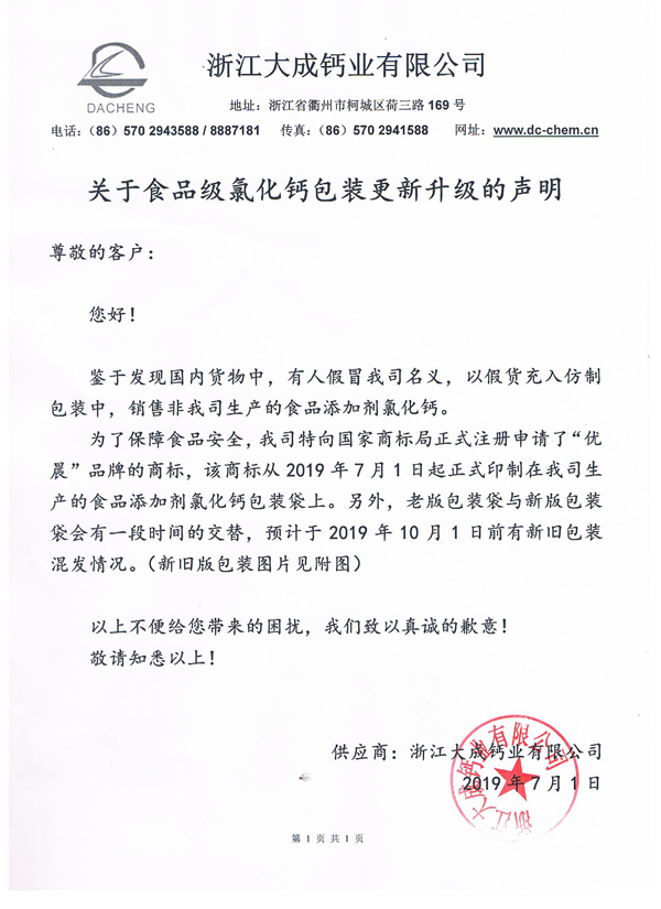 關(guān)于食品級氯化鈣包裝更新升級的聲明